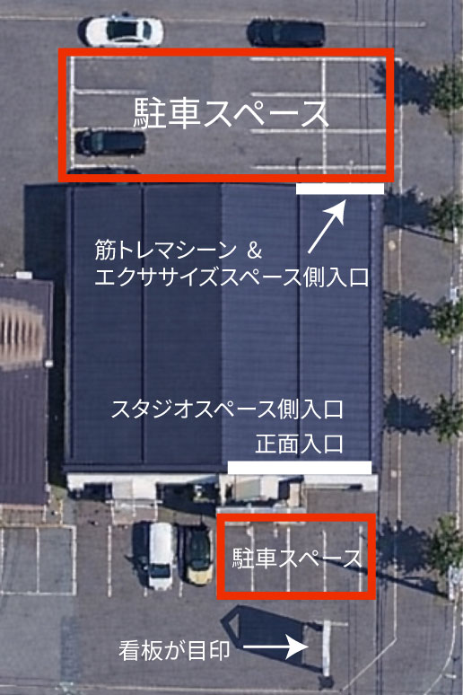赤枠で囲んだエリアが、当店の専用駐車スペースです。